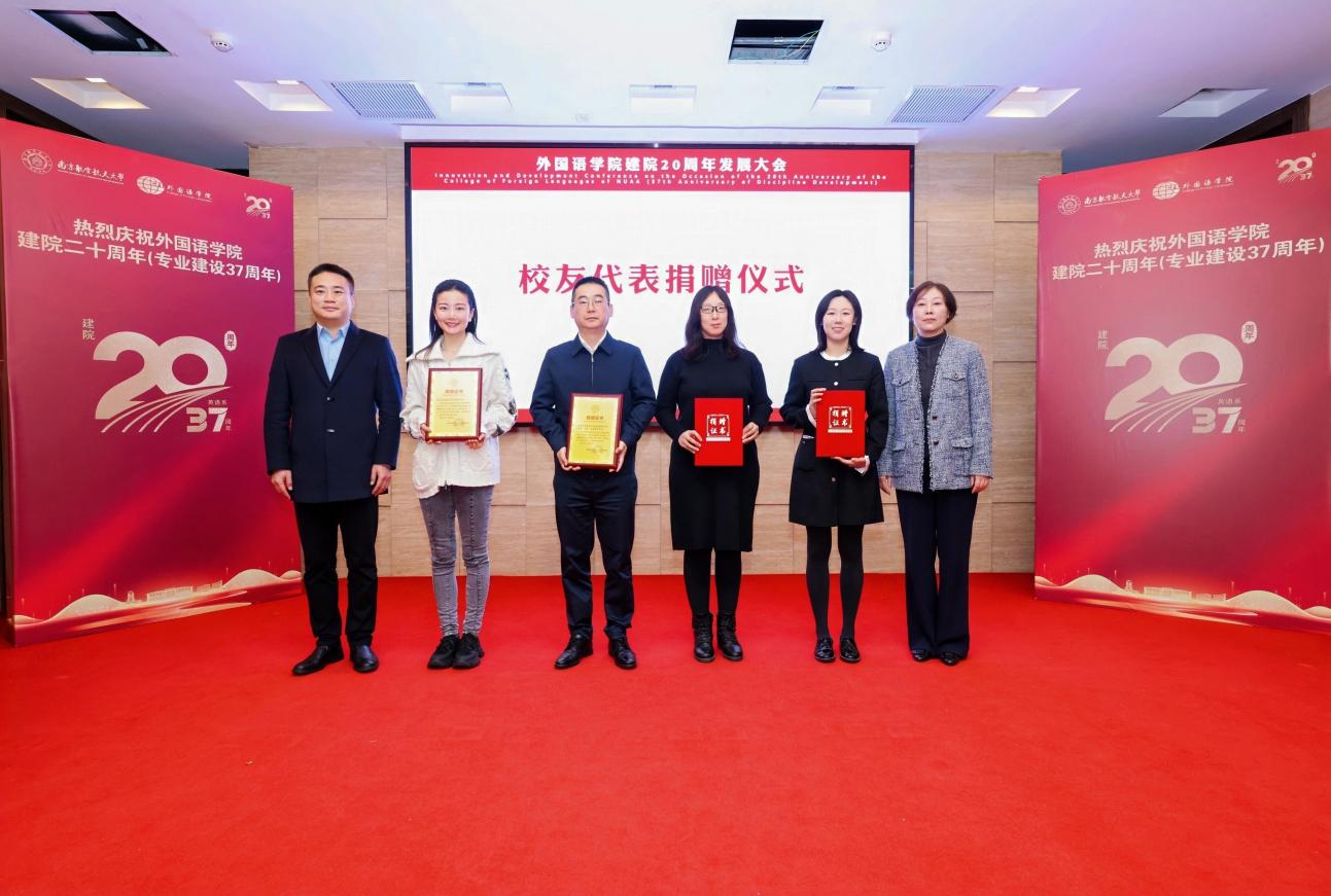長期以來,校友們不僅在事業(yè)上成績卓著,更通過設立獎學金、開展合作項目、提供實習就業(yè)機會等方式,持續(xù)支持學院發(fā)展。南航校友總會秘書長、教育發(fā)展基金會秘書長李和新,外國語學院黨委書記左彤云接受校友捐贈。